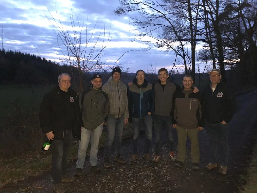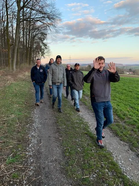 Nach einem kurzweiligen Nachmittag, vieler guter Benzingespräche mit Käseplatte und Schmalzbrot , machten wir und uns zu acht gegen 17:30 Uhr zu Fuß auf den Rückweg.