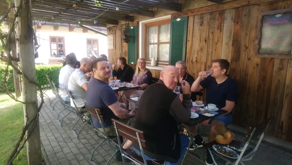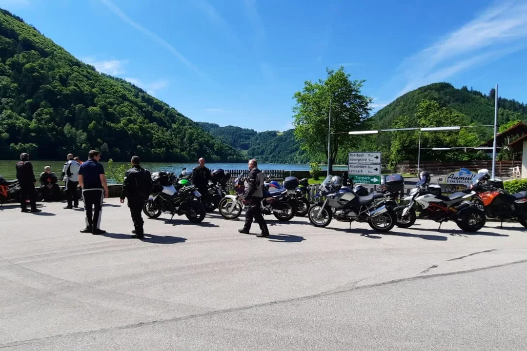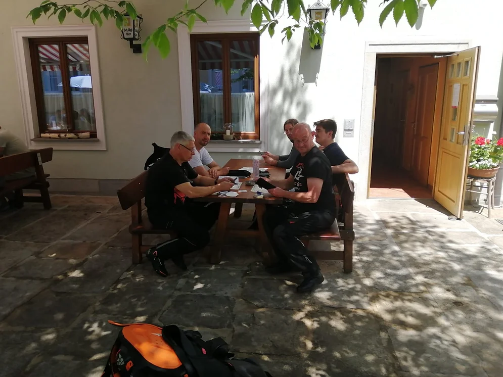 Aufgrund der Corona-Auflagen musste unsere diesjährige Jahresausfahrt in den Juni verschoben werden. Bereits am Mittwochabend haben alle Teilnehmer beim DRK Büchig einen Antigen-Schnelltest durchgeführt. Mit 10 Motorrädern gings dann Richtung Nürnberg los. 2 MFBler folgten mit PKW, Anhänger und den verladenen Motorrädern. Nach der Mittagspause in Berg bei Neumarkt, und 540 absolvierten Kilometern traf die Gruppe gegen 18:00 Uhr im Hotel „Zum Kirchenwirt“ in Kellberg in Niederbayern/Bayrischer Wald ein. Nach dem Begrüßungsweizen wurden die Zimmer bezogen und das Abendessen und der Ausklang fand unter der Pergola statt. Um 22:00 Uhr musste der Ausschank wegen den Pandemie-Auflagen beendet werden. Frühstück um 08:00 Uhr, digitale Einreiseanmeldung für Österreich, Abfahrt um 10:00 Uhr, Corona-Test für Alle in der Teststation Friseurgeschäft und anschließend starteten wir nach Österreich. Mittagspause war in Vorderweißenbach, dann gings Richtung Linz und mit der Fähre über die Donau. Nach einer Kaffeepause fuhren zurück in die Unterkunft. Abends stießen 2 weitere MFBler dazu. Mit nun 14 Motorrädern fuhren wir am Samstag zum Arber. Zuvor natürlich wieder der obligatorische Schnelltest beim Friseur. Mittagspause in Bayrisch Eisenstein und dann um den Arbersee Richtung Passau. Dort eine Einkehr in einem Cafe und ein Bummel durch die Stadt. Zurück im Hotel gabs Spareribs mit Kartoffeln und den Abschluß am Stammtisch. Am Sonntag starteten wir um 09:30 Uhr Richtung Heimat. Größenteils über die Autobahn gefahren, waren alle gegen 18:00 Uhr wohlbehalten am Ausgangspunkt zurück. Außer ein wenig Regen bei der Rückfahrt hatten wir durchweg angenehmes Motorradwetter. Wir legten insgesamt um die 1500 km zurück. Auch konnten wir während der Ausfahrt ein Neumitglied willkommen heißen. Vielen Dank an den Organisator Marco und den Tourguide Michael. Wieder einmal ein toller Ausflug!
